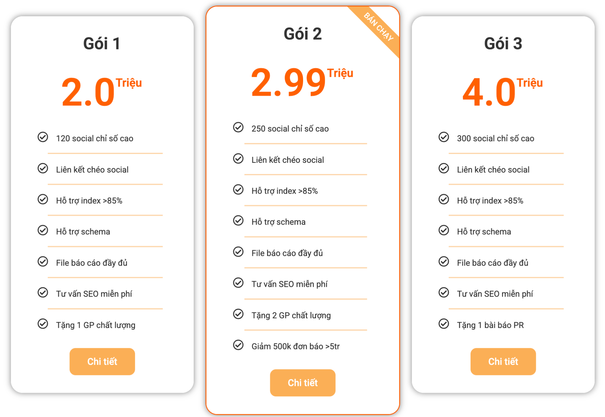 - Gói 2.99 triệu: 250 social chỉ số cao, liên kết chéo social, hỗ trợ index >85%, hỗ trợ schema. File báo cáo đầy đủ, tư vấn SEO miễn phí, tặng 2 GP chất lượng, giảm 500k đơn báo >5 triệu.