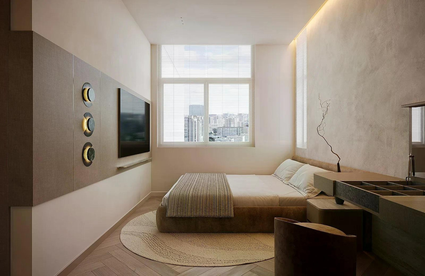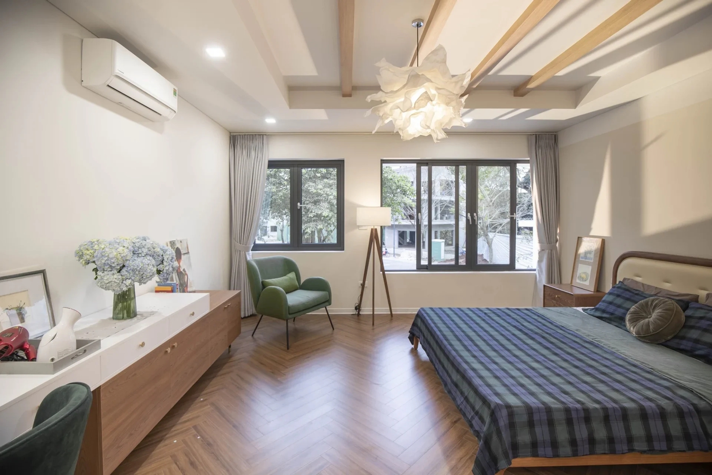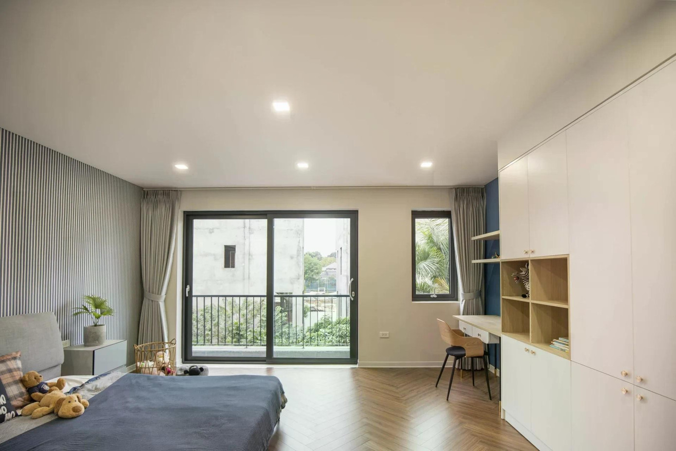 Đi kèm với đó là hệ công tắc dimmer hoặc đèn nhiều mức sáng, cho phép người dùng “chỉnh” phòng ngủ theo từng khoảnh khắc trong ngày. Buổi tối có thể là ánh sáng vàng nhạt dịu dàng, nhưng sáng sớm chỉ cần tăng nhẹ độ sáng để không gian tỉnh táo hơn mà vẫn không gây chói.