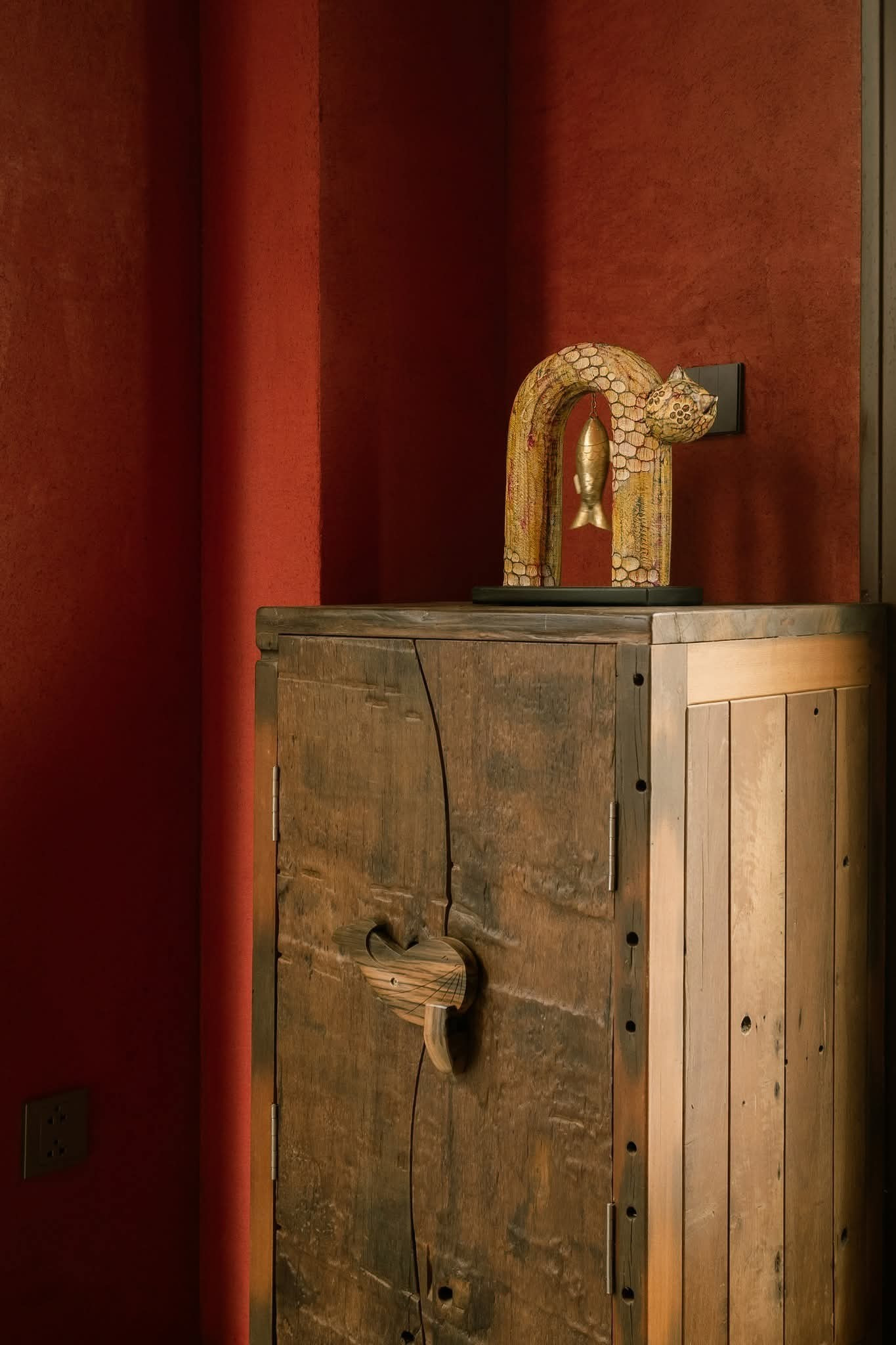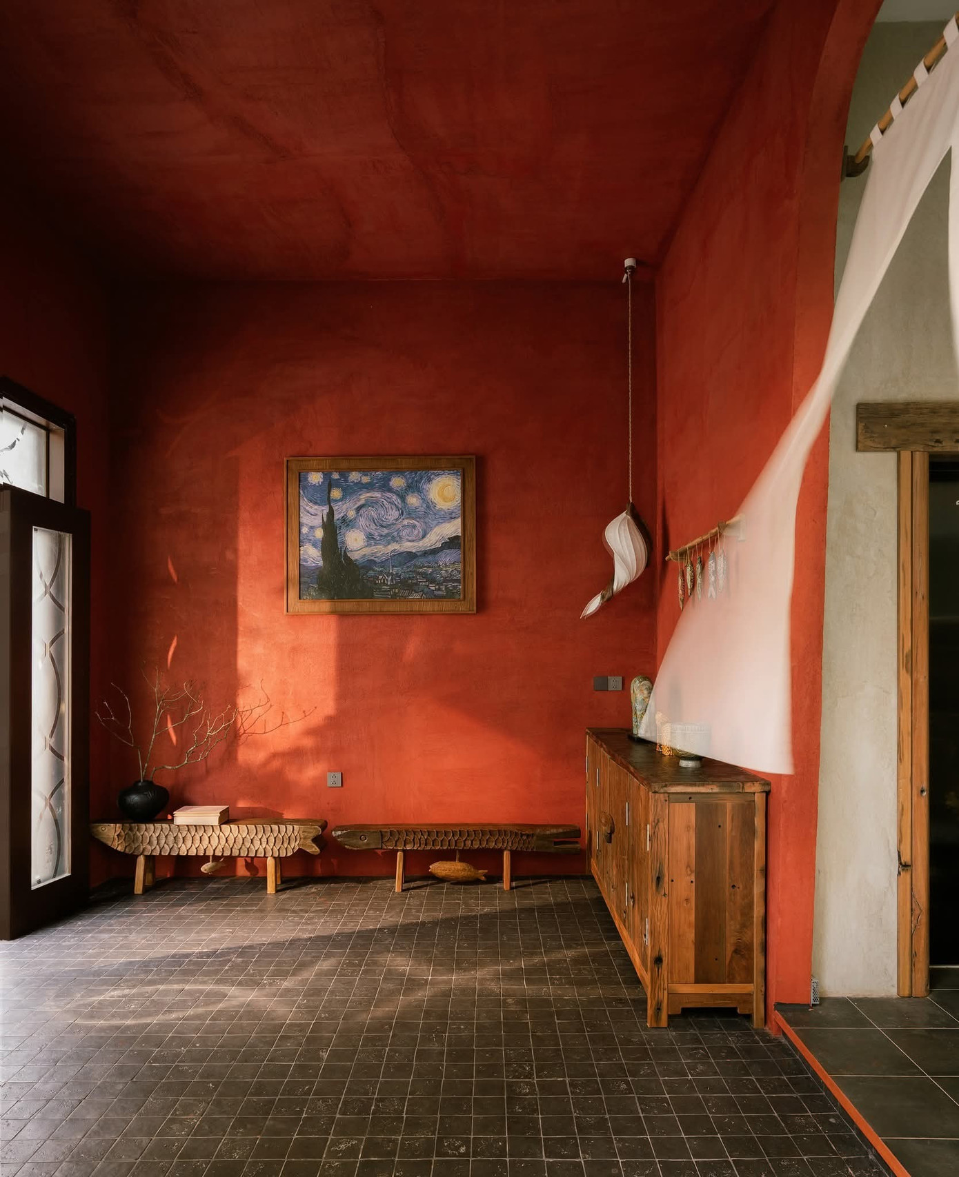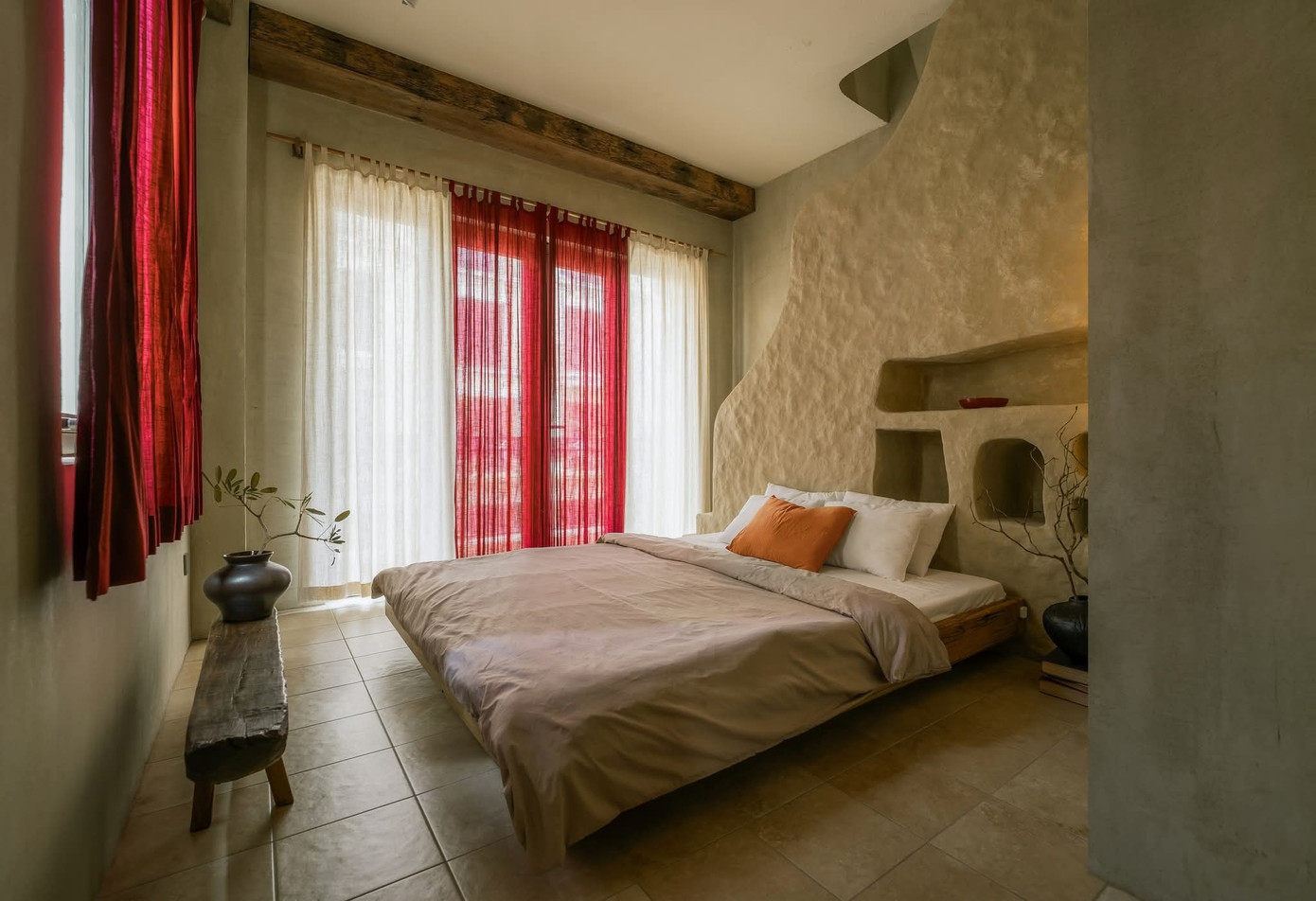 Không gian với tính cách thô mộc và những mảng màu mạnh cá tính. Nội thất gỗ Táu tái sinh từ thuyền cũ và đầy ắp đồ thủ công, vải lanh, đèn giấy,... biến nơi này thành một "hang động" đầy cảm hứng.