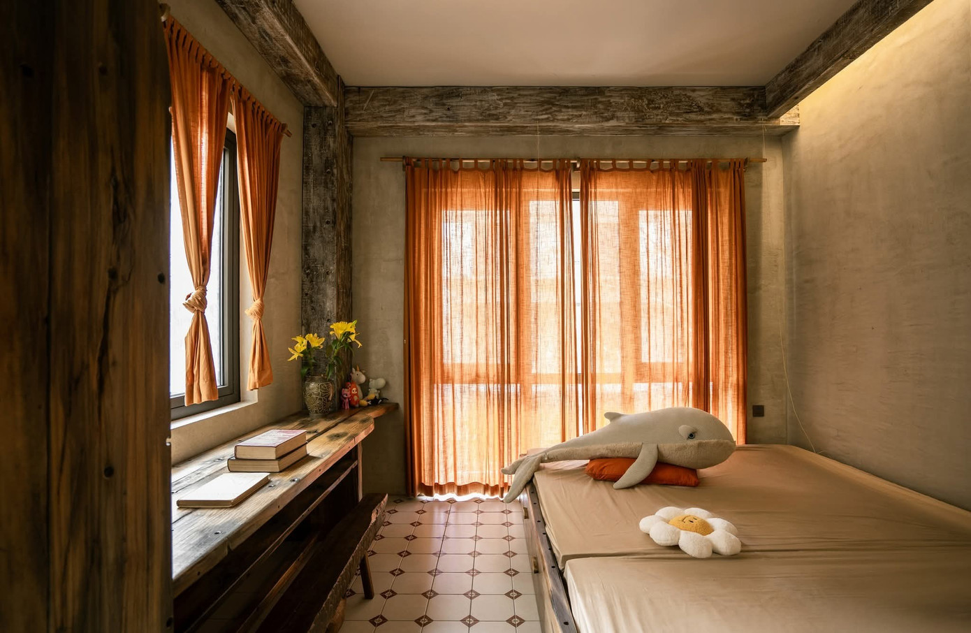 Tinh thần thô mộc không chỉ được thể hiện qua nội thất gỗ mà còn hiện diện qua tường hiệu ứng, vật liệu gạch, đá, đường nét bất đối xứng, bất toàn khắp mọi ngóc ngách.
