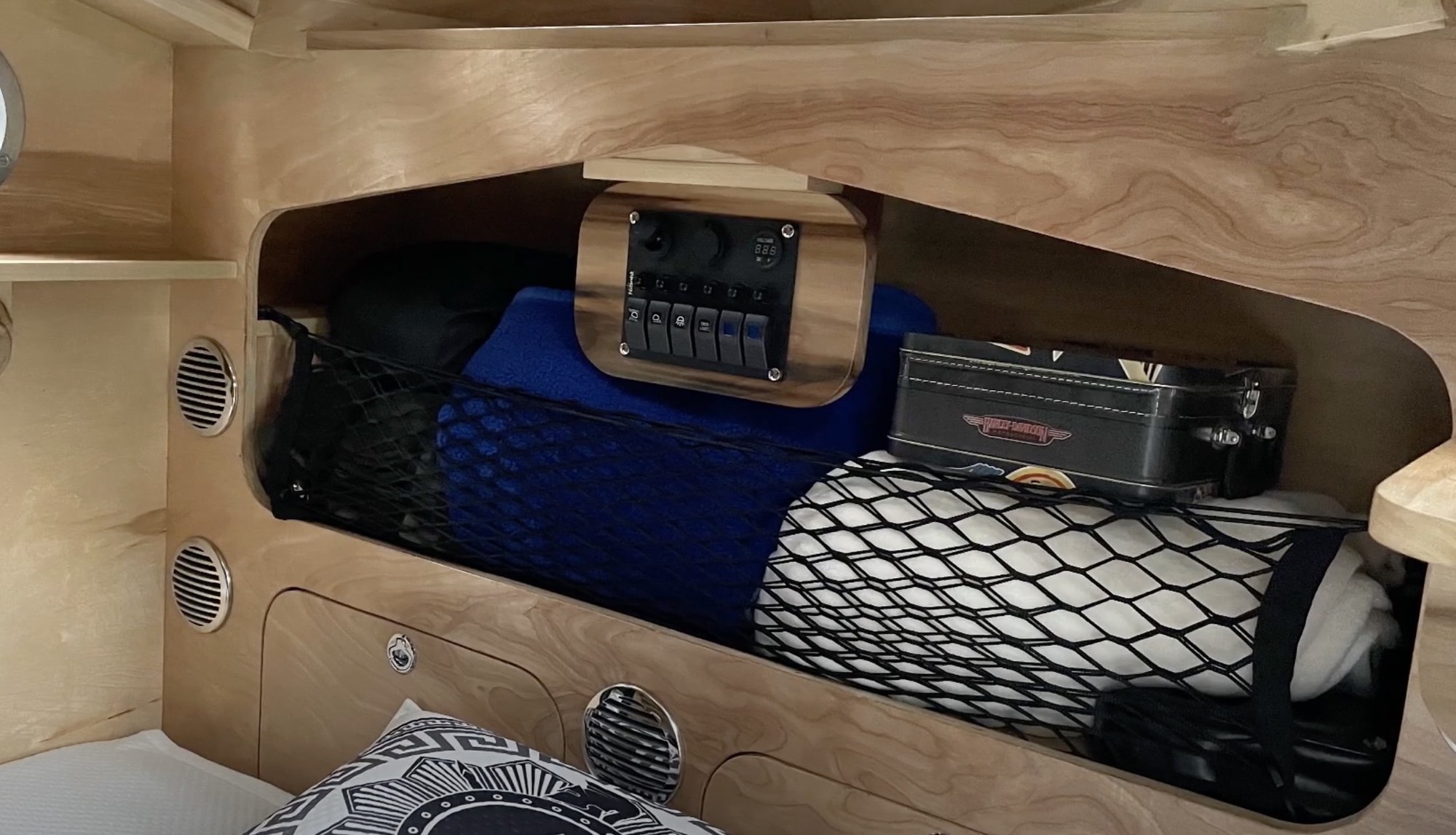 Các kệ tủ xung quanh đảm bảo có nhiều không gian lưu trữ. Một vài lưới chở hàng cũng được sử dụng để tăng thêm không gian để đồ.