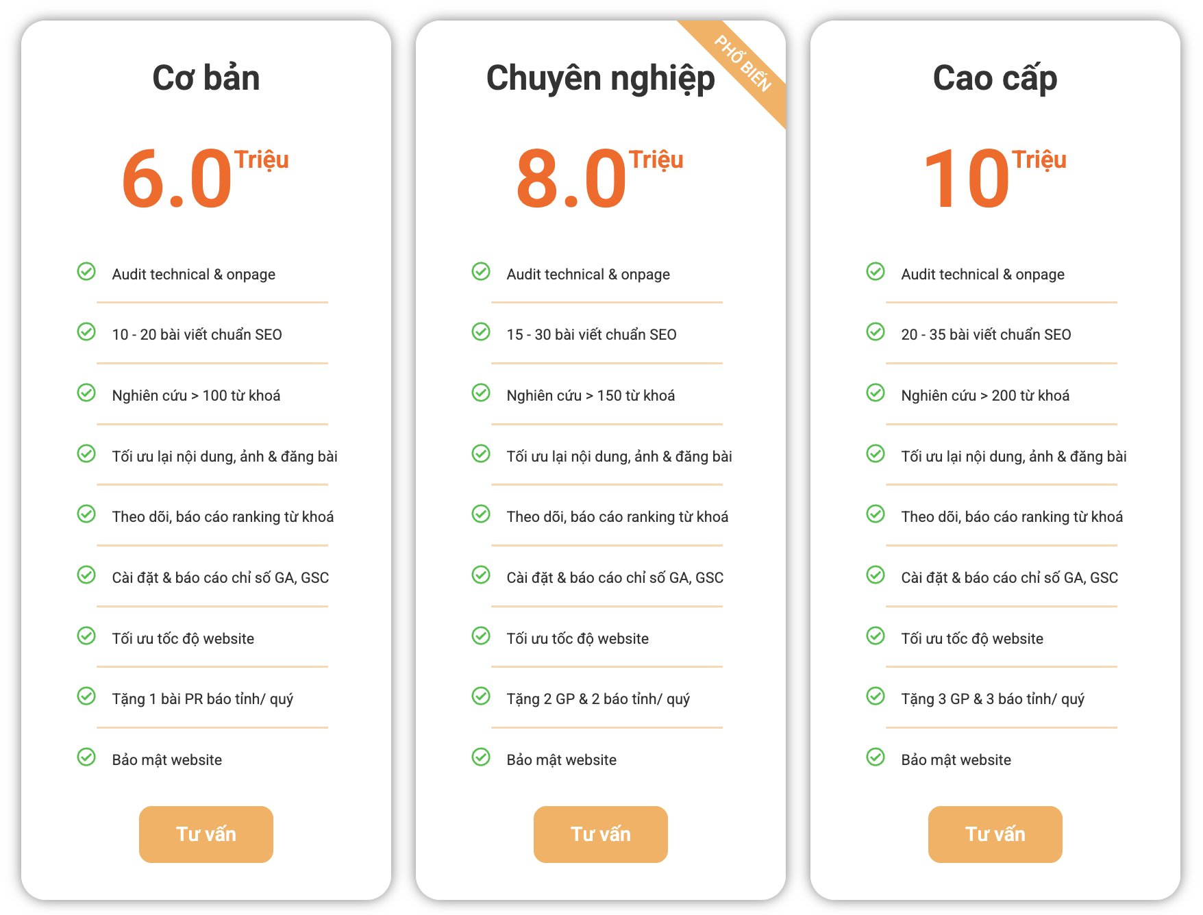 - Gói cơ bản: Tập trung vào các hoạt động nền tảng như audit website, xây dựng 10-20 bài viết chuẩn SEO và nghiên cứu hơn 100 từ khóa, kết hợp tối ưu nội dung, tốc độ và theo dõi hiệu quả.